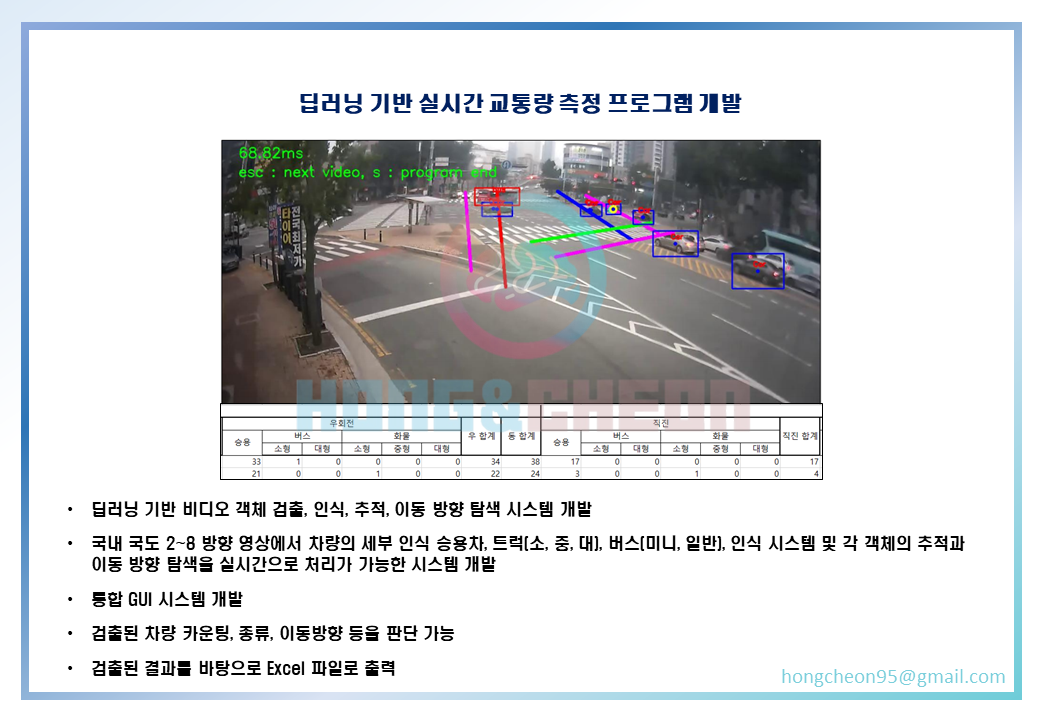 - 국내 국도 2~8 방향 영상에서 차량의 세부 인식 승용차, 트럭(소, 중, 대), 버스(미니, 일반), 인식 시스템 및 각 객체의 추적과 이동 방향 탐색을 실시간으로 처리가 가능한 시스템 개발